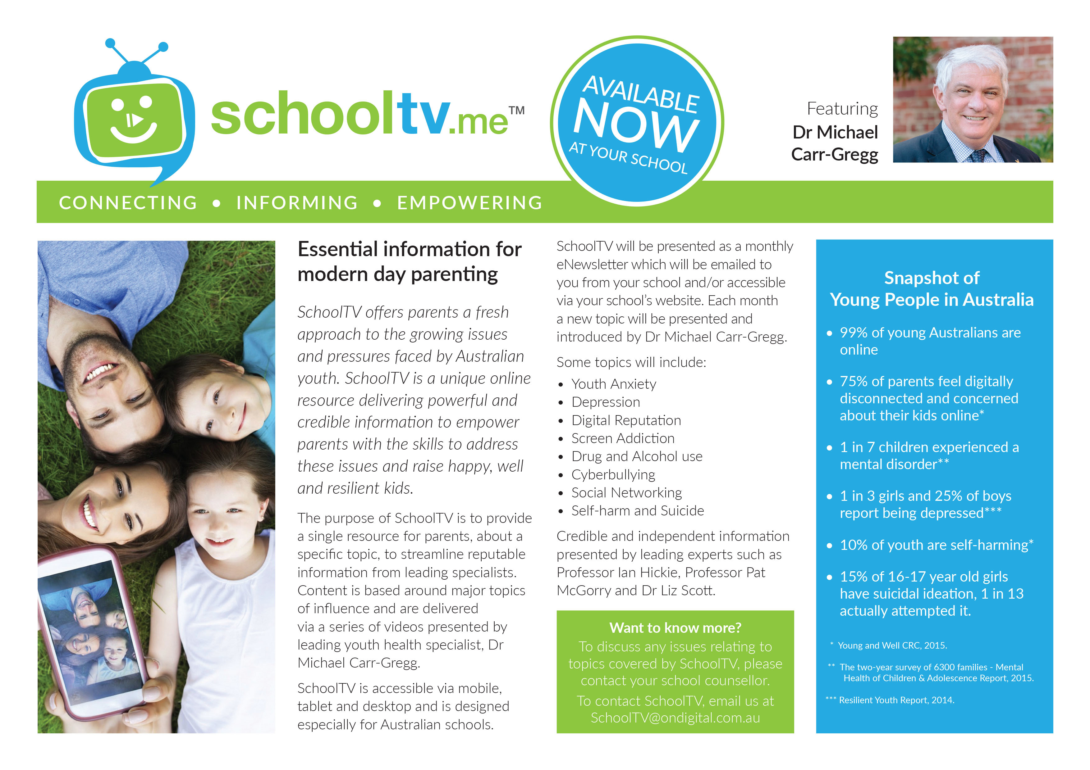 We are excited to launch SchoolTV. Essential information for modern day parenting SchoolTV offers parents a fresh approach to the growing issues and pressures faced by Australian youth. SchoolTV is a unique online resource delivering powerful and credible information to empower parents with the skills to address these issues and raise happy, well and resilient kids.