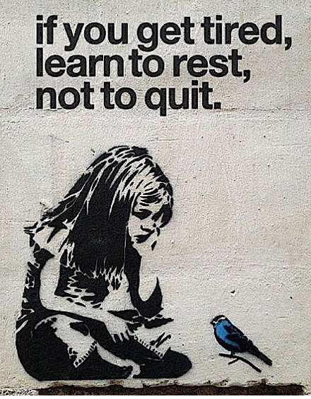 As I reflect on the artist Banksy’s words, "If you get tired, learn to rest not to quit", I wonder if learning to rest requires both giving something up… and taking something up… I’m reminded of Jesus’ words in the Gospel according to Matthew. Jesus said, "Come to me all you who are weary and burdened, and I will give you rest… my burden is light". There’s an invitation here to give up my burdens and take up what God wants for me.