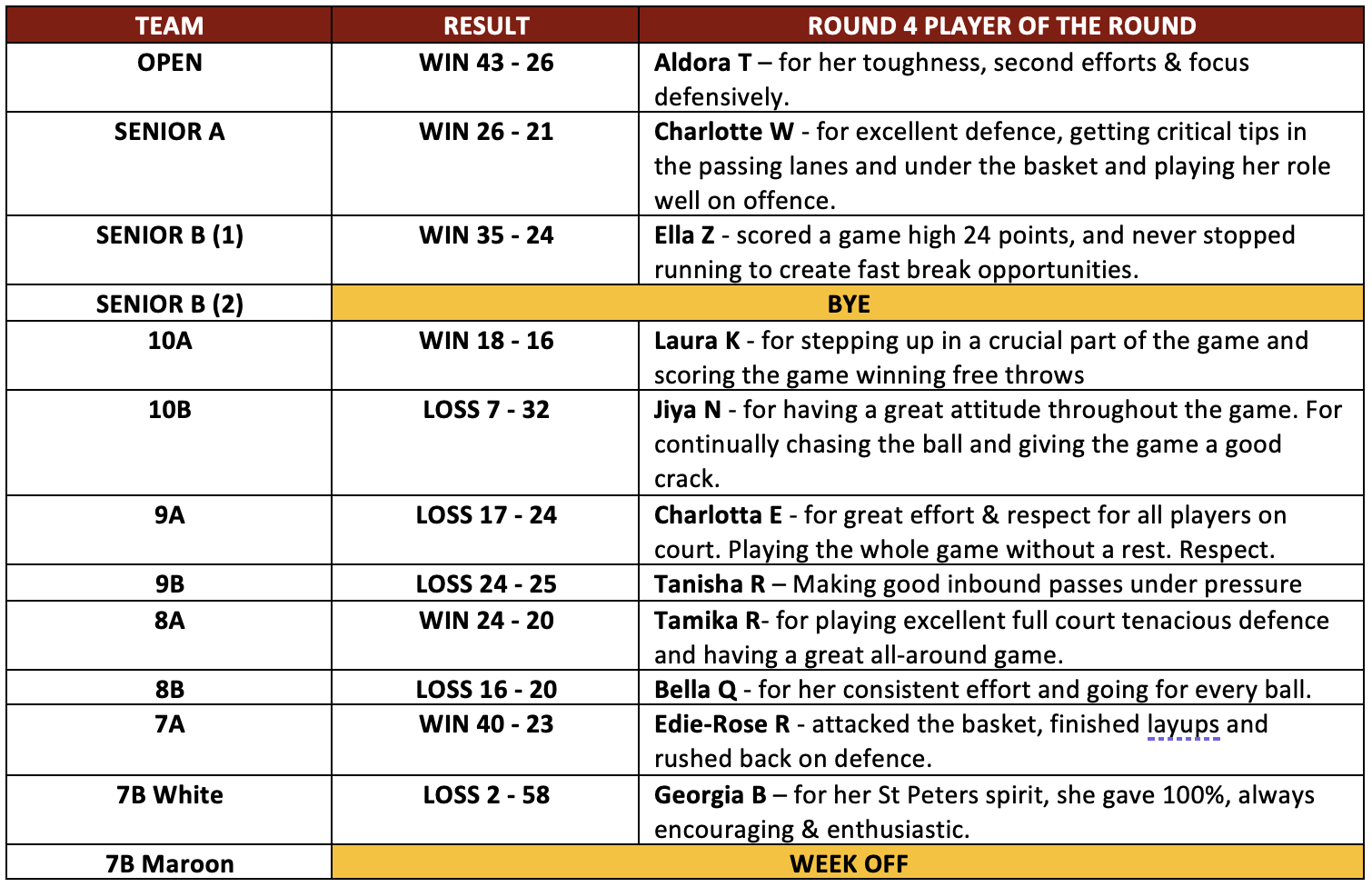 What a great way to start Term Two with Basketball, Football and Touch fixtures recommencing after the holidays with some amazing results against BGGS last Friday afternoon/evening. We look forward to playing Somerville House for Round 5 this Friday, please check the St Peters App for draws and bus details.