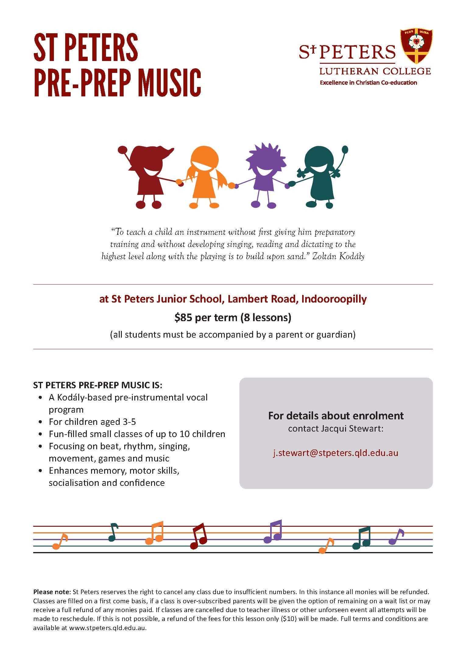 Mrs Jacqui Stewart is the program teacher. For further information about vacancies and class dates, please email: j.stewart@stpeters.qld.edu.au.